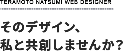 ただ綺麗なだけでなく、伝わる・心を動かすデザインを。安心して任せられる“伴走型デザイナー”です。 デザインそのものが商品やサービスを変えるわけではありません。けれども、お客様にその価値を最初に届ける「伝達の最前線」にあるのがデザインです。課題を解決し、行動を促す力を持つ──その奥深さに惹かれて、私はデザイナーを志しました。 デザインそのものが商品やサービスを変えるわけではありません。けれども、お客様にその価値を最初に届ける「伝達の最前線」にあるのがデザインです。課題を解決し、行動を促す力を持つ──その奥深さに惹かれて、私はデザイナーを志しました。 ■Natsumi Teramoto(福岡県在住)/WEBデザイナー・ヒートマップ解析士「ワクワクを届けたい」「最高の価値を提供したい」──そんな商売人の父の背中を見て育ち、 私も現在同じ想いを持ってWebデザインに取り組んでいます。これまで旅行会社ではカウンターセールスとしてお客様一人ひとりに最適なプランをご提案し、 ベンチャー企業ではオンライン秘書として幅広いサポート業務を経験してきました。そこで培った「相手の気持ちに寄り添う力」と「丁寧でわかりやすい対応力」は、現在のデザインの仕事にもつながっています。「依頼してよかった」と心から思っていただけるように、これからも寄り添いながら真心を込めてサポートしてまいります。 ■Natsumi Teramoto (福岡県在住)/WEBデザイナー・ヒートマップ解析士「ワクワクを届けたい」「最高の価値を提供したい」──そんな商売人の父の背中を見て育ち、 私も現在同じ想いを持ってWebデザインに取り組んでいます。 これまで旅行会社ではカウンターセールスとしてお客様一人ひとりに最適なプランをご提案し、 ベンチャー企業ではオンライン秘書として幅広いサポート業務を経験してきました。そこで培った「相手の気持ちに寄り添う力」と「丁寧でわかりやすい対応力」は、現在のデザインの仕事にもつながっています。 「依頼してよかった」と心から思っていただけるように、これからも寄り添いながら真心を込めてサポートしてまいります。 お名前 メールアドレス 電話番号 お問い合わせの種類(複数選択可) ご相談お見積り お問い合わせ内容 プライバシーポリシーに同意する *
