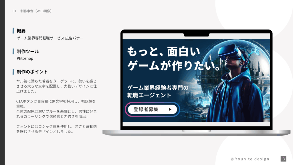【求人バナー】ゲーム業界専門転職サービス 求人広告バナー 使用ツール・スキルPhotoshop制作期間2日工夫点・課題解決ポイント20代前半・ゲーム業界に挑戦したい方がクリックしたくなるような、ワクワクする躍動感のあるデザインに ご提案書の一部をご紹介! ご覧いただきありがとうございます。Younite Designは、ただ美しく見せるだけのデザインではなく、「目的」と「意図」を持ったデザインを大切にしています。一つひとつの制作に丁寧に向き合い、クライアントさまの想いをしっかりと形にすることを心がけています。目指すゴールを共有し、確かな成果へとつながるデザインを共に創っていけたらうれしいです。 その他の制作実績を見る
