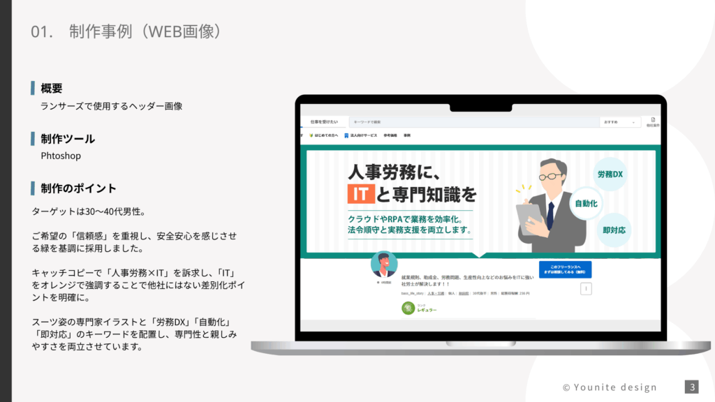 【ヘッダー画像】ランサーズ用ヘッダー画像 使用ツール・スキルPhotoshop制作期間2日工夫点・課題解決ポイント「人事労務×IT」を訴求し、「IT」をオレンジで強調することで他社にはない差別化ポイントを明確に ご提案書の一部をご紹介! ご覧いただきありがとうございます。Younite Designは、ただ美しく見せるだけのデザインではなく、「目的」と「意図」を持ったデザインを大切にしています。一つひとつの制作に丁寧に向き合い、クライアントさまの想いをしっかりと形にすることを心がけています。目指すゴールを共有し、確かな成果へとつながるデザインを共に創っていけたらうれしいです。 その他の制作実績を見る