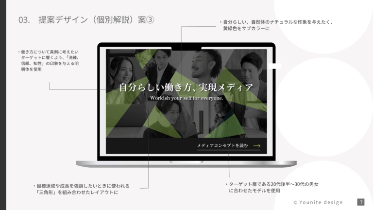 【バナー制作】柔軟な働き方を提案するメディア 使用ツール・スキルPhotoshop制作期間2日工夫点・課題解決ポイントキャッチコピーに合わせ、多様なシチュエーションで働くモデルを起用。自分らしく自然体でいられる雰囲気を表現。 ご提案書の一部をご紹介! ご覧いただきありがとうございます。Younite Designは、ただ美しく見せるだけのデザインではなく、「目的」と「意図」を持ったデザインを大切にしています。一つひとつの制作に丁寧に向き合い、クライアントさまの想いをしっかりと形にすることを心がけています。目指すゴールを共有し、確かな成果へとつながるデザインを共に創っていけたらうれしいです。 その他の制作実績を見る
