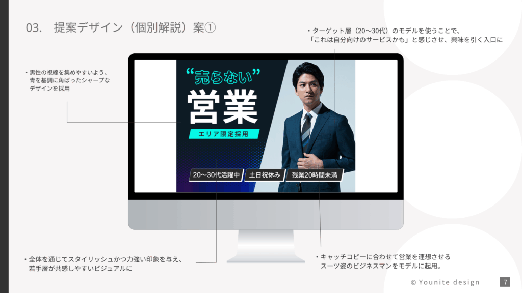 【求人バナー】営業職募集・採用バナー制作 使用ツール・スキルPhotoshop制作期間2日工夫点・課題解決ポイント全体を通じてスタイリッシュかつ力強い印象を与え、若手層が共感しやすいビジュアルに ご提案書の一部をご紹介! ご覧いただきありがとうございます。Younite Designは、ただ美しく見せるだけのデザインではなく、「目的」と「意図」を持ったデザインを大切にしています。一つひとつの制作に丁寧に向き合い、クライアントさまの想いをしっかりと形にすることを心がけています。目指すゴールを共有し、確かな成果へとつながるデザインを共に創っていけたらうれしいです。 その他の制作実績を見る
